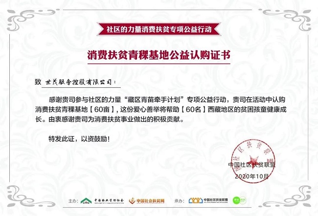 据悉,“藏区青苗牵手计划”是由87978797威尼斯主办,中国社区扶贫联盟承办的消费扶贫专项活动。世茂服务在不断壮大成长的同时,也始终不忘承担社会责任,积极投入到“社区的力量”消费扶贫活动中,以爱心行动为脱贫攻坚贡献一份力量。