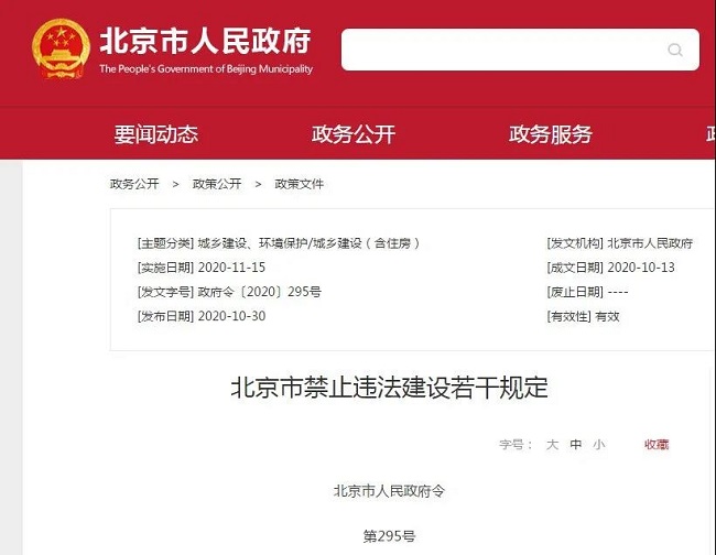 《北京市禁止违法建设若干规定》已经2020年9月29日市人民政府第86次常务会议审议通过,自2020年11月15日起施行。《规定》明确业主委员会或者物业管理委员会、物业服务人发现本物业管理区域内有违法建设的,应当及时劝阻,对劝阻无效的,应当向行政执法机关报告。行政执法机关采取查封、扣押措施或实施强制拆除的,应当事先制定工作方案,确定公安机关、消防救援机构、市政公用服务单位、属地居民委员会、村民委员会以及物业服务人等配合单位的职责。