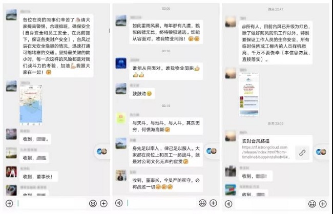 19日凌晨3点,台风越来越逼近珠海。看着窗外风狂雨斜、噼啪作响,一直在统筹指挥的华发物业董事长周文彬在公司工作群鼓励大家:坚持最关键的数小时,每一次这样的风险都是对我们战斗力的考验,加油!我跟大家在一起!过了几分钟,他又再次鼓励大家:如此雷雨风暴,每年都有几遭,貌似凶猛无比,终将狼狈遁逃。谁能从容面对,唯我物业同胞!台风雨深夜,来自公司领导的深情鼓励极大地提振了大家的士气和斗志。