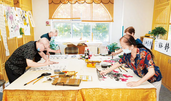 老党员在社区邻里中心开展书画活动