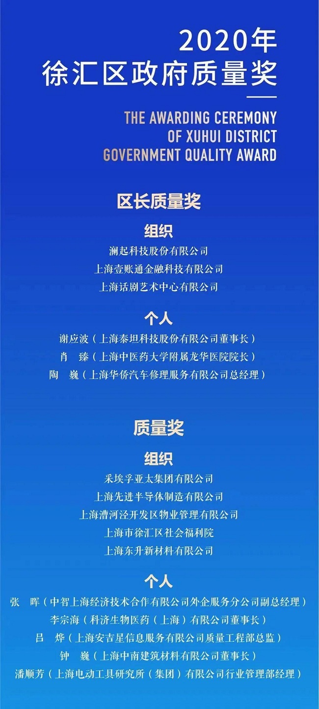 2020年12月2日,由徐汇区质量工作领导小组主办的2020年徐汇区政府质量奖颁奖仪式在西岸美术馆隆重举行。