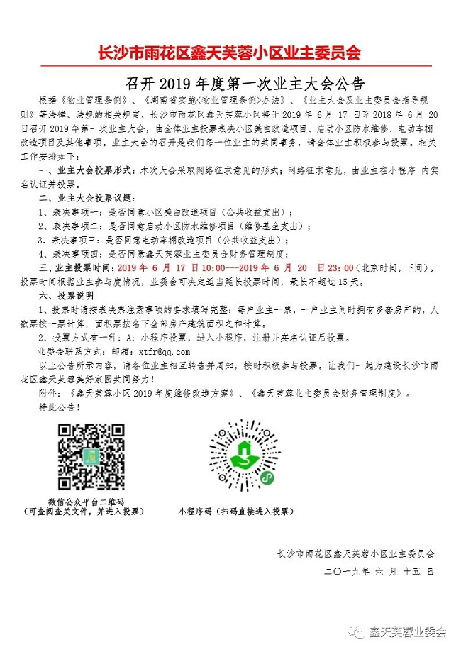 鑫天芙蓉召开2019年度第一次业主大会公告