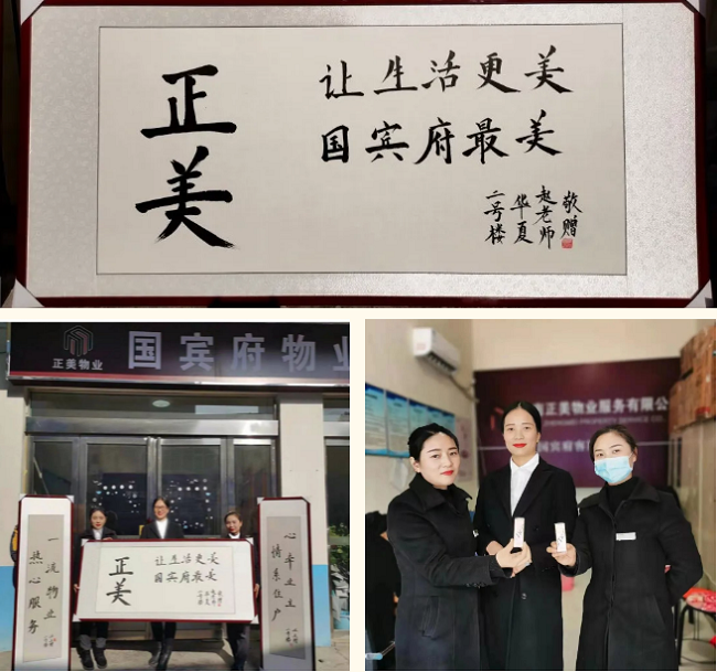 2020年12月10日上午,正美物业国宾府2号楼业主赵老师来到物业客服中心,送来三幅1.7米的字画,“正美让生活更美 国宾府最美”、“心牵业主 情系住户”、“一流物业 热心服务”,字里行间,热情洋溢。