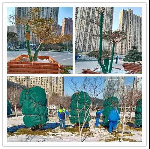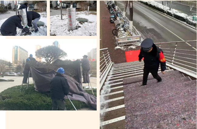 对室外消防栓、阀门加用棉毯进行保温防冻;给绿化树木也“穿上”一层保暖衣物防冻。工程部、秩序部人员加强对园区、楼内各种设备管道的巡查工作,保障正常运行。