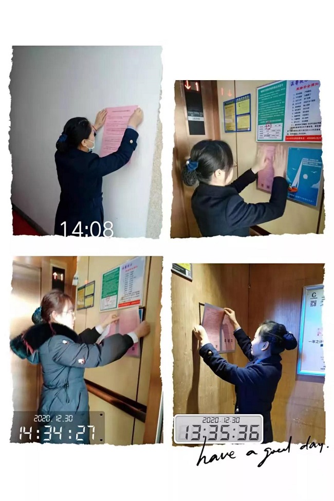 针对极端天气下居民用水、用电安全,各项目管理处在小区主要通道、宣传栏、楼道防盗门等显著位置张贴温馨提示,提醒居民注意防冻,避免用电过度发生火灾等事故。