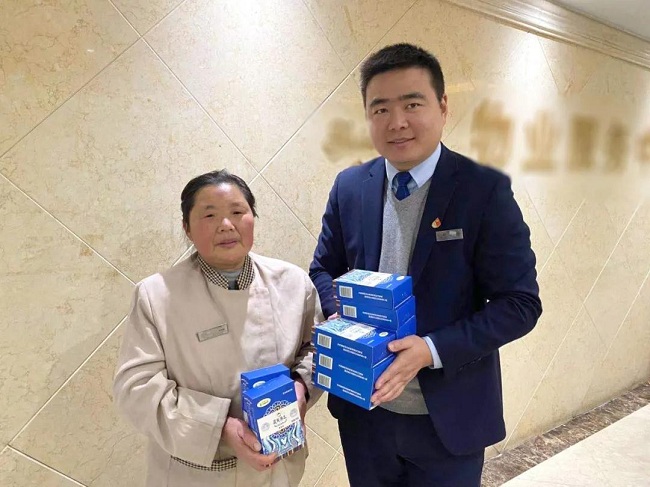 在这次爱心延续的捐赠活动中,戚远珍的名字就闪亮地列在捐赠名单中,金色黎明物业主任方军旗代表公司向戚大姐赠送了10斤西藏青稞米,希望她在新一年里健康、快乐。