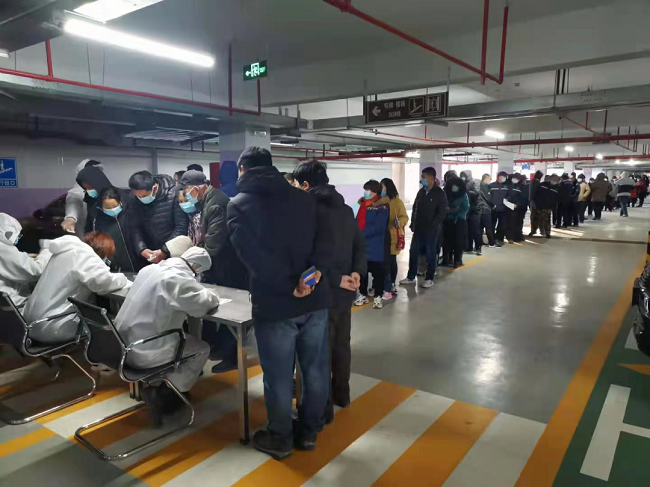 在石家庄碧桂园凤凰城,十几位连续工作不归家的物管人员也在忙碌着。在这个常住人口有5000多人的社区里,1月6日到8日的核酸检测取样工作是一个不小的工程。