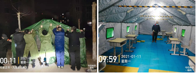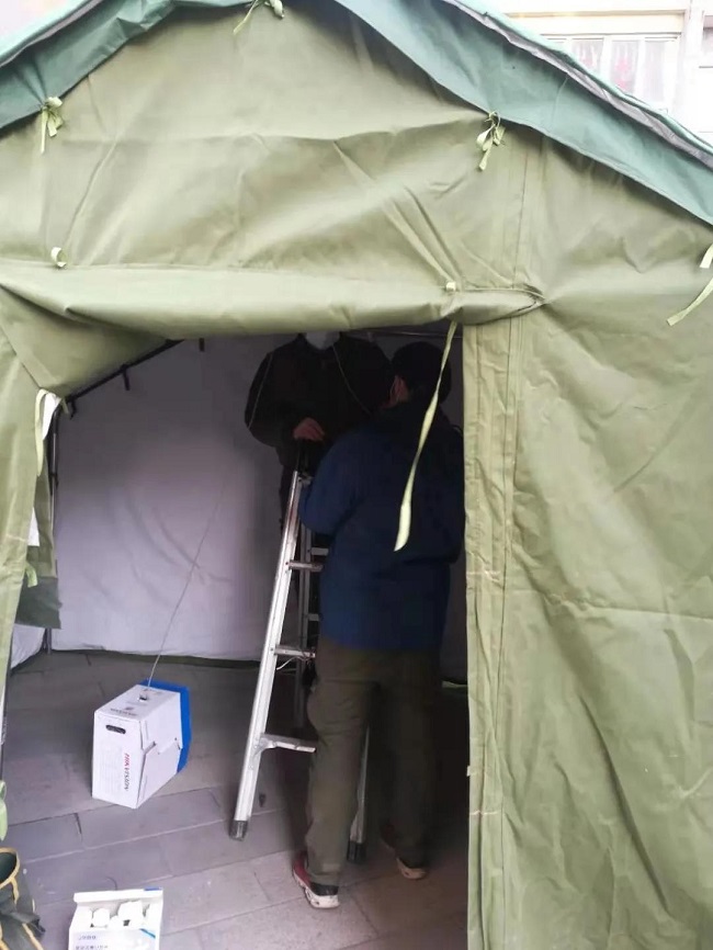 帝华提前根据各小区二次核检工作需要,搭建临用帐篷,搬运检测所需桌椅,安装照明设施,准备垃圾收纳桶、无死角消毒杀菌工作等。