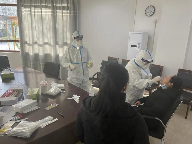 1月10日下午,金易达物业全体员工进行核酸检测,应检尽检, 不漏一人。图为金易达物业员工核酸检测现场。