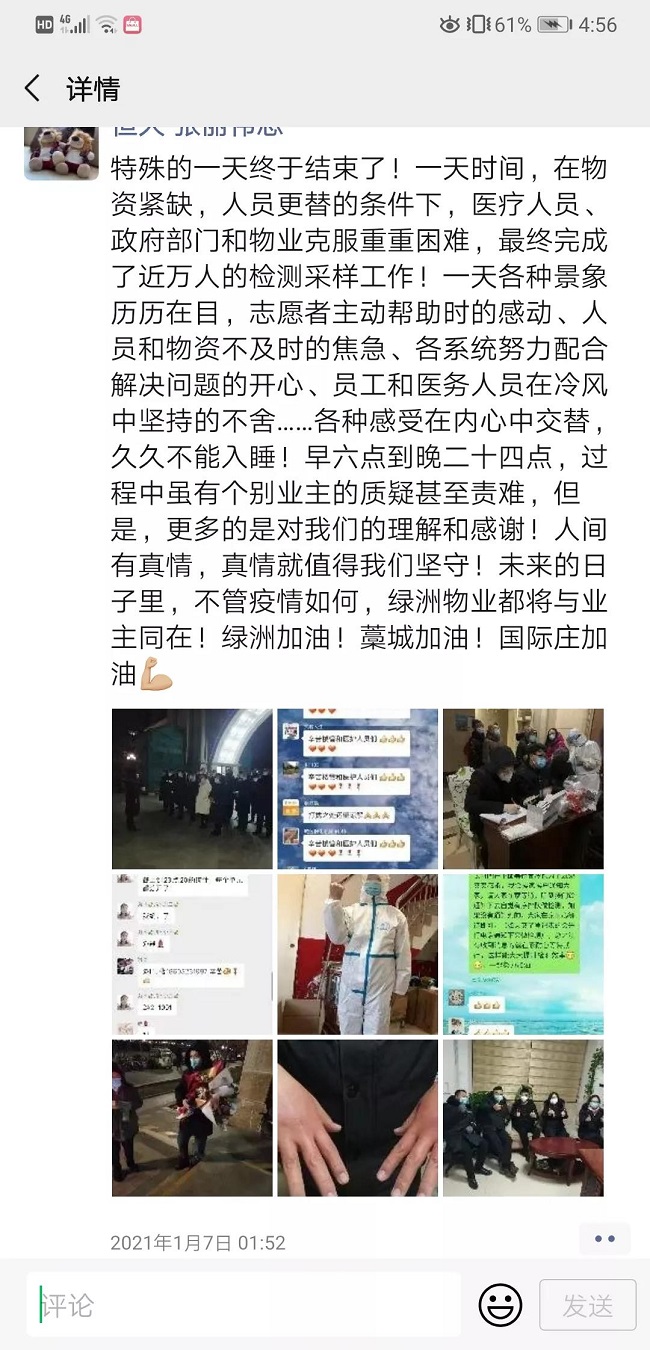 石家庄恒大绿洲属于藁城区,防疫工作难度可想而知。项目物业负责人张丽伟1月6日凌晨5点收拾行李赶赴石家庄恒大绿洲,直至1月11日一直坚守工作岗位,配合管委开展防疫各项工作。