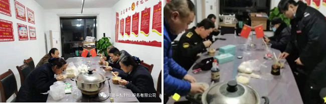 图为中鼎物业工作人员在吃便饭