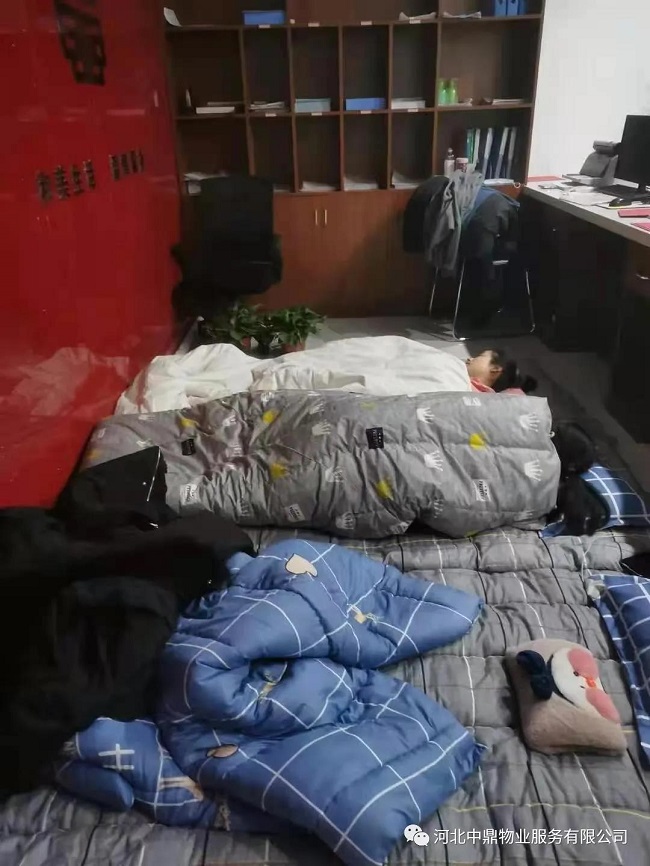 图为中鼎物业工作人员打地铺睡觉。