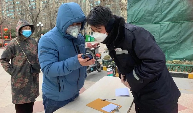 图为信之兰物业工作人员对出入人员进行体温检测登记。
