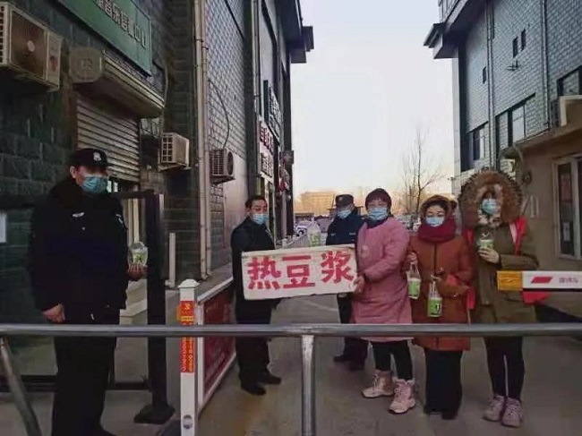 图为清晨热心商户提着暖暖的豆浆送给值守的帝华物业工作人员。