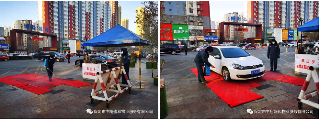 图为中翔盛和物业铺设地毯进行车辆消毒。