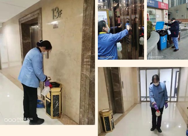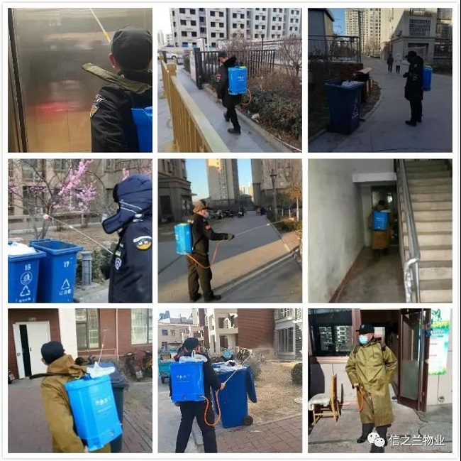 信之兰物业在小区出入口设立防控检查点、封闭管理,安排专职人员24小时值守。每日不少于两次对电梯、楼道、楼梯、垃圾桶等公共区域进行消毒。