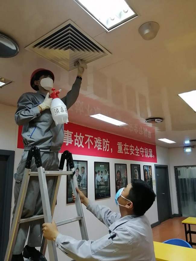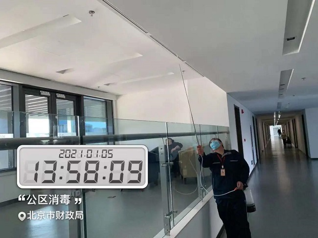 首开实业一分公司加强对市政府办公区消杀力度,组织物业人员每天对电梯、门把手、卫生间、茶水间、热水器、中央空调等开展两次以上的消毒,确保不留死角。