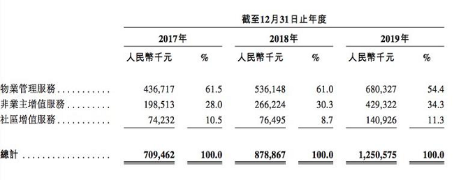 事实上,从招股书数据显示,优势资源整合的确让荣万家的社区增值服务发展的颇有声色。近三年来,荣万家社区增值服务取得了稳步增长。2017年、2018年、2019年收入分别为7423万元、7649万元、1.4亿元,占整体总收入的10.5%8.7%11.3%