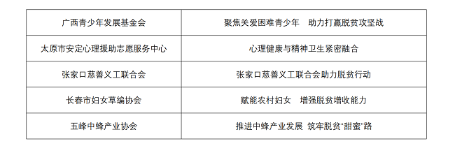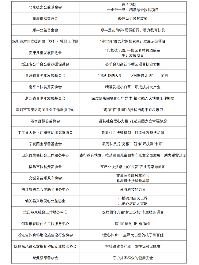 为深入总结社会组织参与扶贫的经验,发现和挖掘社会组织参与扶贫典型,动员和引导广大社会组织积极参与脱贫攻坚,2020年,国务院扶贫办社会扶贫司开展了社会组织扶贫案例研究项目。经过初审、专家评审、官网公示等环节,最终评选出“社会组织扶贫案例50佳”。现将名单通告如下: