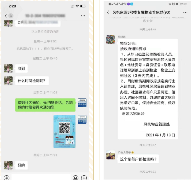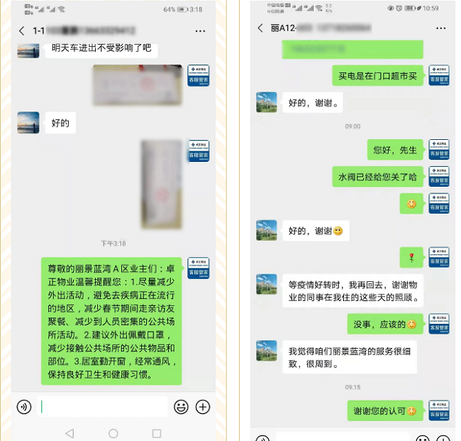 客服管家在朋友圈推送疫情相关温馨提示,覆盖内容含新型冠状病毒预防注意事项,疫情防控信息日报、核酸检测注意事项等等,给业主传递正能量,及时安抚并疏导业主。线上服务、线下“跑腿”,居家不方便外出的,客服管家帮忙充电和采购。