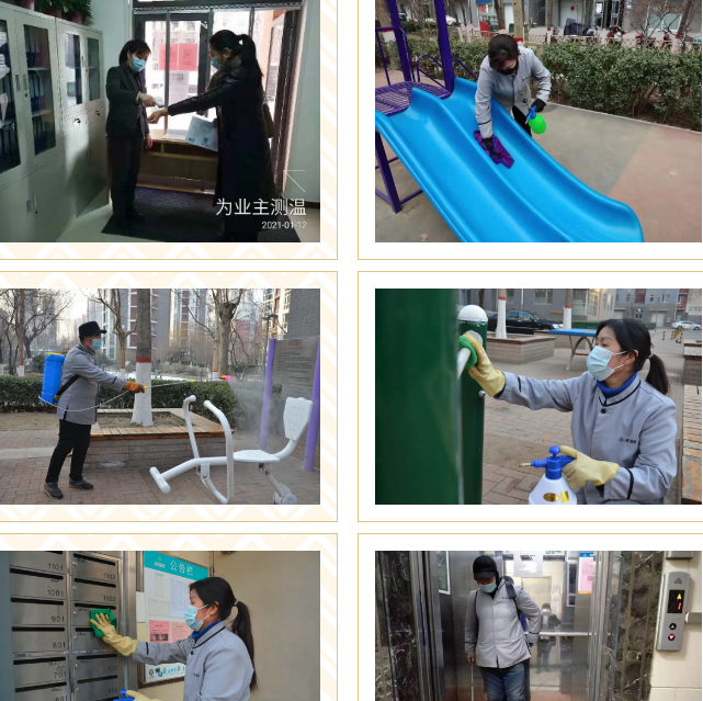 卓正物业人严格按照要求,身扛消毒喷雾器、手持消毒瓶。对园区公共大堂、楼道、电梯轿厢、公共设施、儿童娱乐设施、园区休憩区、出入口岗亭、地下车库等各个角落进行无死角消杀工作;并对高频接触的物体表面,如电梯间按钮、扶手、门把手等地方进行定点定时多频次消毒,做到360°全覆盖定点消毒,给业主营造一个放心的生活环境。