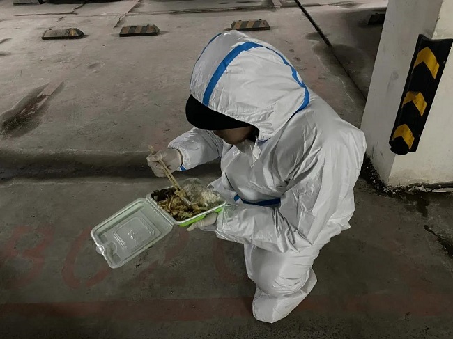 物业工作人员蹲在地上吃着早已冻凉的盒饭