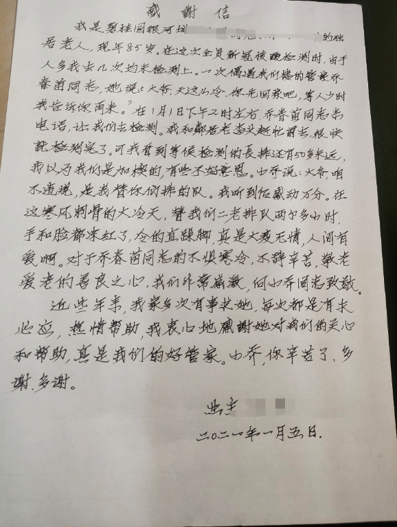 1月5日,沈阳碧桂园银河城物业办公室收到了一封手写的感谢信。这封感谢信来自两位80多岁的业主。原来,前一日,退休老人王大爷和李大爷被凤凰管家乔春苗通知后,没有排队直接做了核酸检。是乔春苗一直在寒风里帮两位老人排队,让他们不用等待,快速完成采样。