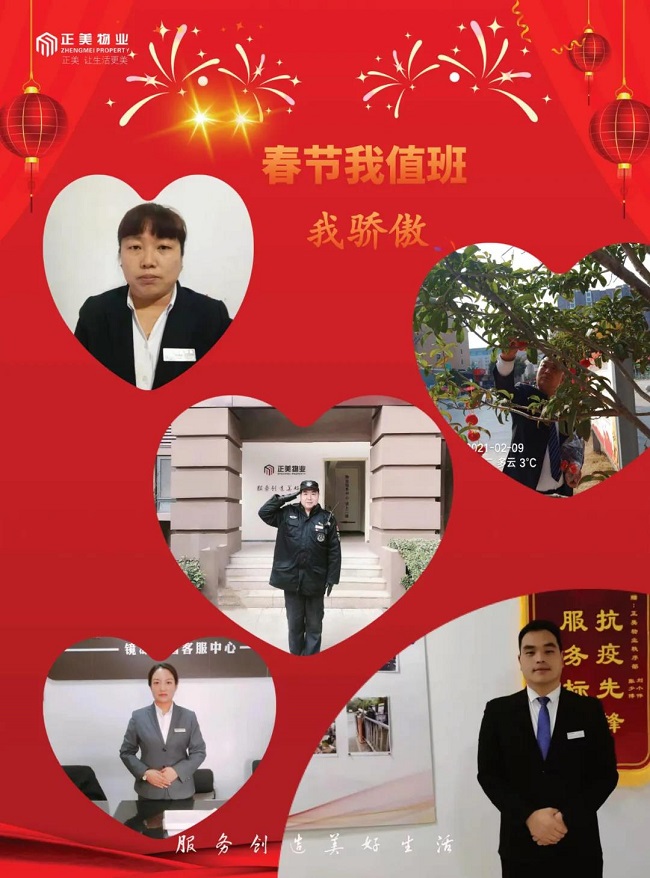 在这阖家团圆的新春佳节,当窗外万家灯火点亮欢欣喜悦,一批正美物业人因为责任所在、业主所需,远离家人,坚守岗位,没有犹豫,没有怨言,他们说:“春节我值班,我骄傲”!