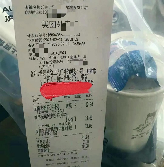 哈尔滨 | 中海江城一位业主为春节留守的安管员送去热奶茶,订单上的备注内容:“帮我送给正门外的保安小哥,谢谢你,辛苦啦!新年快乐!”。