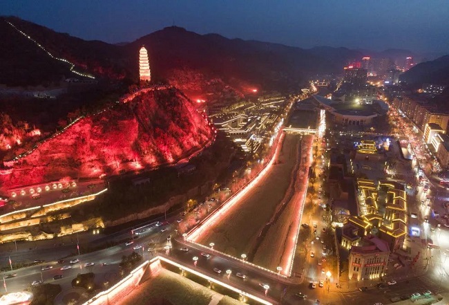 宝塔山下延安城区夜景(2月8日摄,无人机照片)。新华社记者 邵瑞 摄