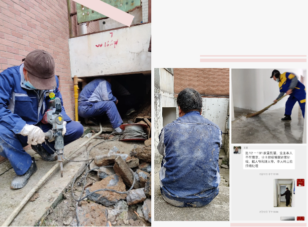 管家与业主联系后经业主授权同意秩序人员可从阳台翻窗进入家中开门处理,服务中心总值韩琳立即安排值班工程戴强、端志存和李大玲带上工具前往疏通,并安排2-3名保洁员前往业主家中及时帮助清扫积水。当时正值中午用餐时间,工程师傅和保洁师傅为了第一时间解决好业主家中漫水问题,顾不上吃饭,其中戴强师傅没吃饭低血糖在现场头晕了两次还继续工作,经过2个多小时师傅们的共同协作,终于解决好了漫水问题,业主家中也被工作人员清扫的干干净净。