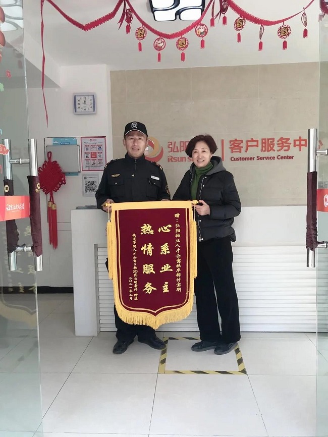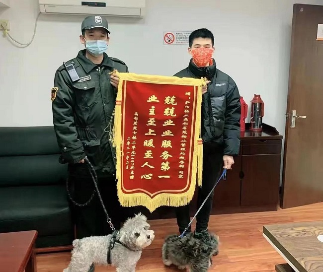 晶都茗苑七栋二单元一户业主春节期间本不打算回老家,但突然家中有急事需立刻回去,可是家中两条宠物狗不方便带回老家,放这边又无人照料。情急之下就抱着试试看的想法来到物业,正好遇到正在值班的秩序领班刘宽,在了解业主的诉求后,刘宽二话没说主动承担起照顾两条宠物狗的责任。五天后业主回到小区,刘宽将两条宠物狗完好的交到业主手中。业主表示非常感谢,特意送来锦旗感谢物业的帮助。