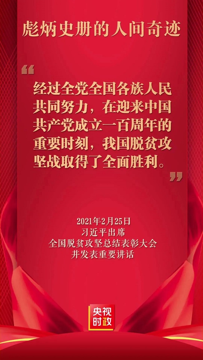 习近平总书记指出,“经过8年持续奋斗,我们如期完成了新时代脱贫攻坚目标任务,现行标准下农村贫困人口全部脱贫,贫困县全部摘帽,消除了绝对贫困和区域性整体贫困......”,庄严宣告“在迎来中国共产党成立一百周年的重要时刻,我国脱贫攻坚战取得了全面胜利”。中国共产党带领全国各族人民,为困扰千百年的绝对贫困问题历史性地划上句号,既是亘古未有的壮举,也是人类减贫史上的奇迹,充分体现了中国共产党领导作为百年大党的信仰、信念、作风、拼劲,我国社会主义制度的显著优势,彰显了中国人民万众一心、同甘共苦的团结伟力。