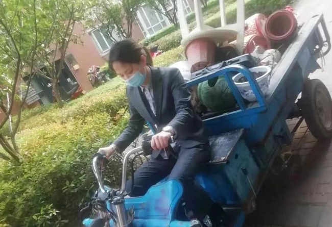 怕自己送水速度太慢,耽误老年业主做午饭的时间,安秋鸽便借来三轮车,拿上几个空桶,到附近小区去接自来水。瘦弱的身躯吃力地蹬着三轮车,将一桶桶近40斤的水送到每一位老年业主手中。