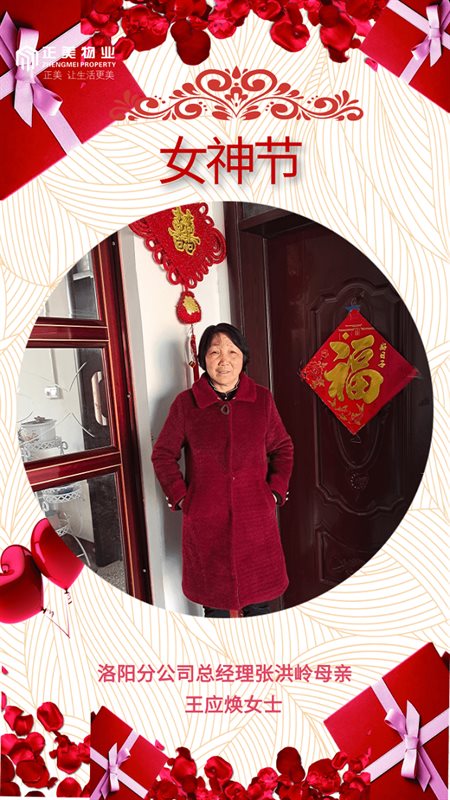 王应焕女士,正美物业洛阳分公司总经理张洪岭的母亲,和蔼、宽容,默默做家人成长路上的支持者,面对孩子因为工作需要远离家乡、连续十年没有在家过中秋、每年除夕到初三都要坚守岗位,给予高度的理解。每每拿起电话,总是叮咛,要把工作做好、不要担心家里。没有非凡之举,却用行动体现着一位母亲的胸怀与大爱。