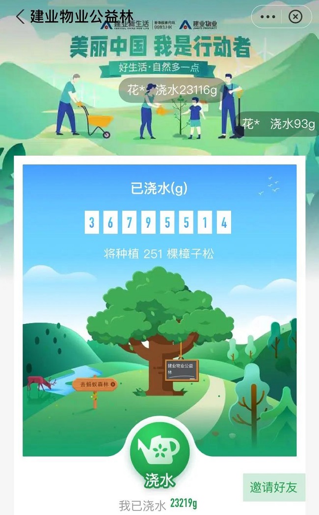 经过多次方案的沟通与灵感碰撞,建业物业成功在支付宝蚂蚁森林上线“建业物业公益林”,“低碳打榜赛”活动于3月1日正式启动后,新奇的玩法及裂变传播,吸引大量业主及员工家人参与,曾以日浇水量达10吨的成绩霸占榜首。截至3月13日,活动圆满完成,日均浇水量均保持在蚂蚁森林公益林日榜首页,总浇水量突破36.7吨,可在边远荒漠地带种植樟子松251棵。