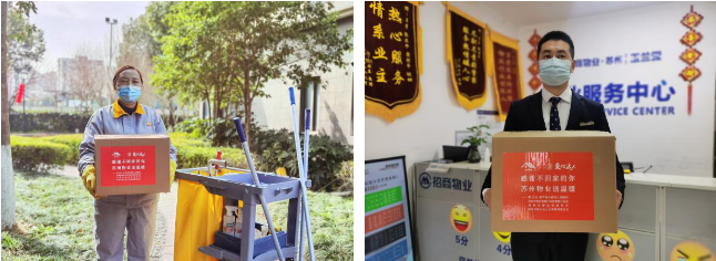 为了向闫海英、刘帮奇一样的春节留岗物业人表达浓浓的谢意,感谢一线物业人员的付出,苏州市物业管理协会通过苏州市物业管理行业慈善爱心基金为2021春节期间坚守岗位的一线物业人——1000名秩序维护员、1000名保洁员,送出了150元/人慰问标准的礼包。