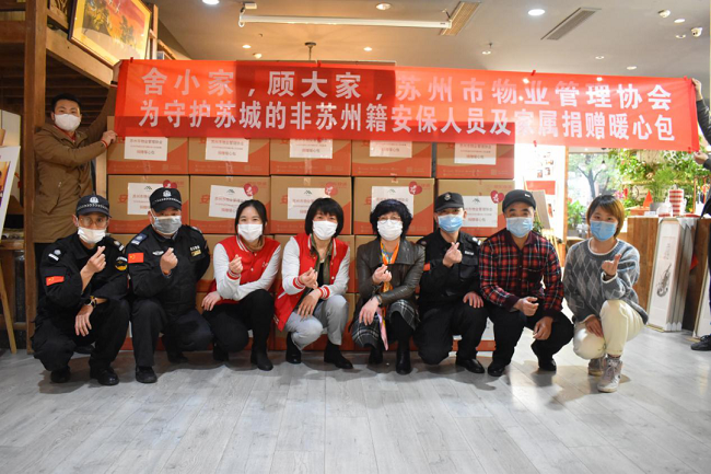 为了致敬疫情期间非苏州籍安保人员,2020年3月,苏州市物业管理协会携手苏州市爱心达人公益慈善基金会,为疫情期间所有坚守在苏州的非苏州籍安保人员及家人送上1296份暖心包,让他们的家人放心、孩子学习安心,也让在岗安保人员暖心。