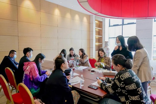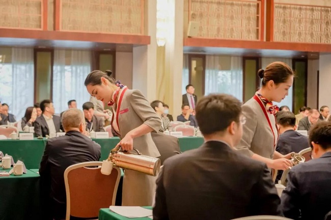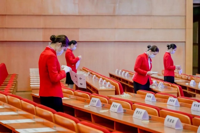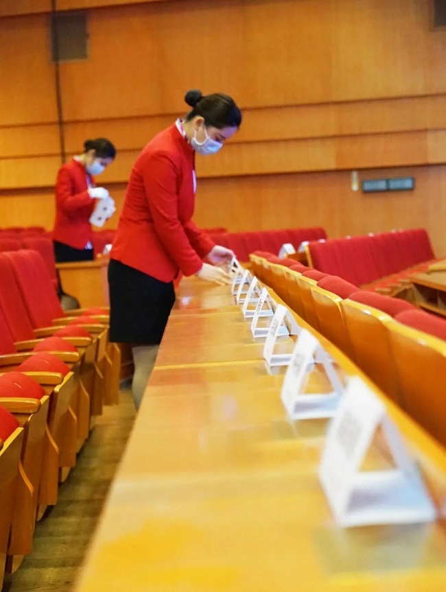 礼仪接待组负责会议现场布置,他们严格按照标准摆放茶杯、会议资料、台卡等物料,让会场焕然一新,静候参会嘉宾的到来。