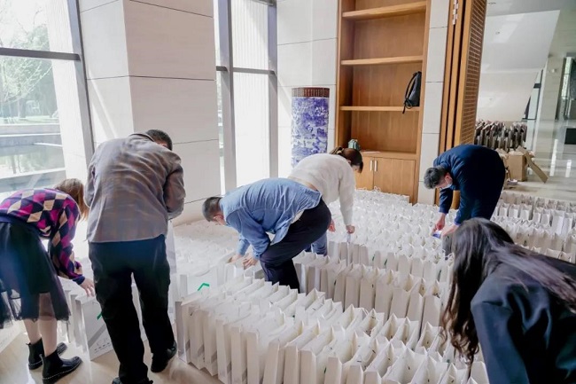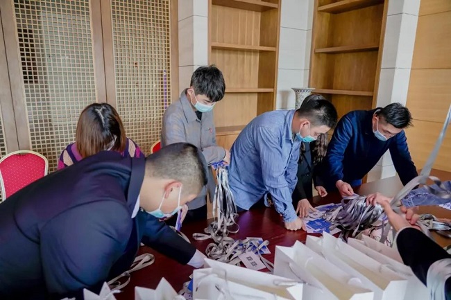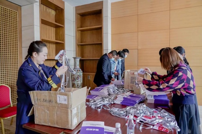 资料对接组成员将如山的会议材料一一分装、核对,确保每位嘉宾拿到手的资料准确无误。