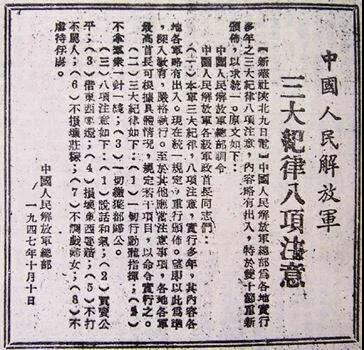 194710月,解放军总部发布了《关于重行颁布三大纪律八项注意的训令》。人民解放军各部队行军作战做到人不踏青苗、马不啃树皮,不拿群众一针一线,买卖公平,进入城市露宿街头不扰民……人民军队以严明的纪律赢得了人民群众的信任,为战争胜利提供了坚强保障。
