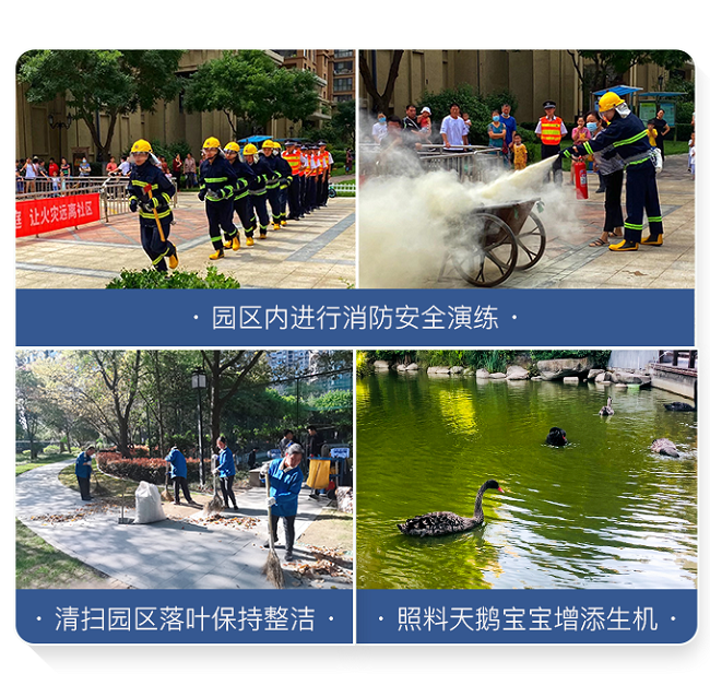 换季及时清扫落叶,整洁常在;精心照料池中天鹅,生机勃勃;园区安全重于泰山,反复进行消防演习……让业主们的幸福感,来源于园区中的点点滴滴。