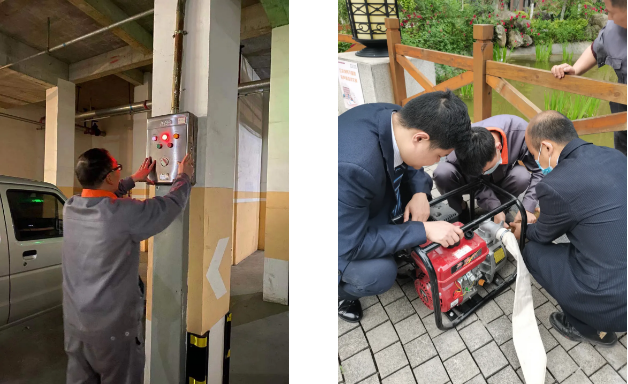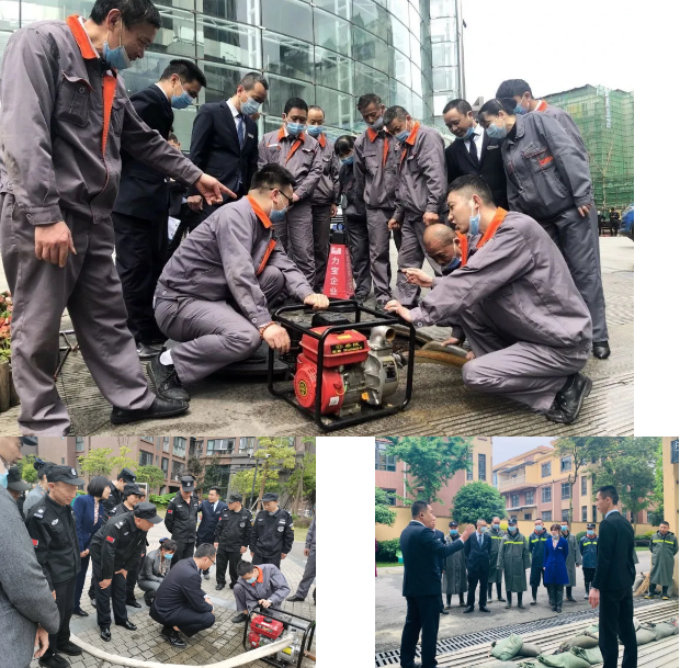 现场模拟因持续暴雨导致地下车库出现水情告急的情况。接到险情后,防汛应急小组迅速启动应急预案!