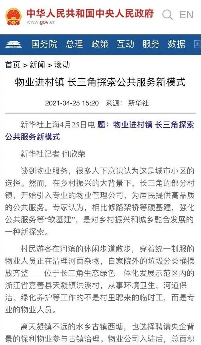 4月25日,中央人民政府网站以转载新华社报道的形式,对保利物业“物业进村镇的长三角公共服务新模式”进行了关注。