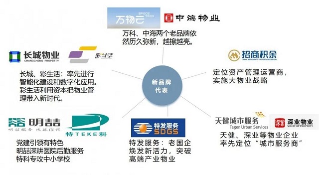 万科、中海两个老品牌历久弥新,越擦越亮。万科物业更名为万物云空间科技服务股份有限公司,向空间科技服务商转变,并推出了万物云城、万科物业、万物梁行三大空间子品牌。中海物业稳健发展,并登陆资本市场。长城、彩生活率先进行智能化建设和数字化应用,而且彩生活还利用资本把物业管理带入了发展新时代。天健、深业两家物业服务企业率先定位为城市服务商。特科物业、明喆物业突出党建引领,且很有特色,在具体业务领域上,明喆物业深耕医院后勤服务,特科物业专攻中小学校。特发服务则是老国企焕发新活力,在高端产业物业管理上取得突破。招商积余定位为资产管理运营商,实施大物业战略。