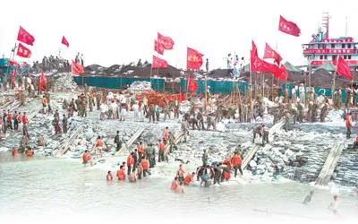 19987月,为确保荆江大堤的安全,数千名解放军官兵以惊人的毅力坚守在大堤上,排除决堤险情。图为战士们运送袋装沙石加固大堤。新华社记者 李 刚摄