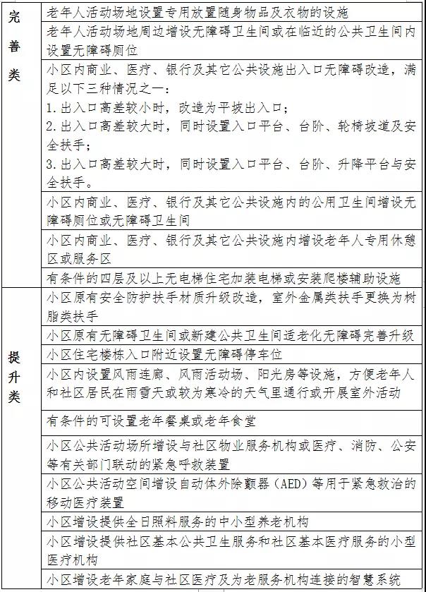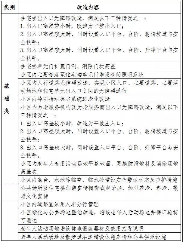 老旧小区适老化改造和无障碍环境建设,包括通行无障碍改造、公共空间适老化改造、完善适老化公共服务设施、增加居家养老服务有效供给等方面,具体改造内容分为基础类、完善类和提升类。基础类是必须改造的内容,完善类和提升类是根据居民意愿确定的改造内容。