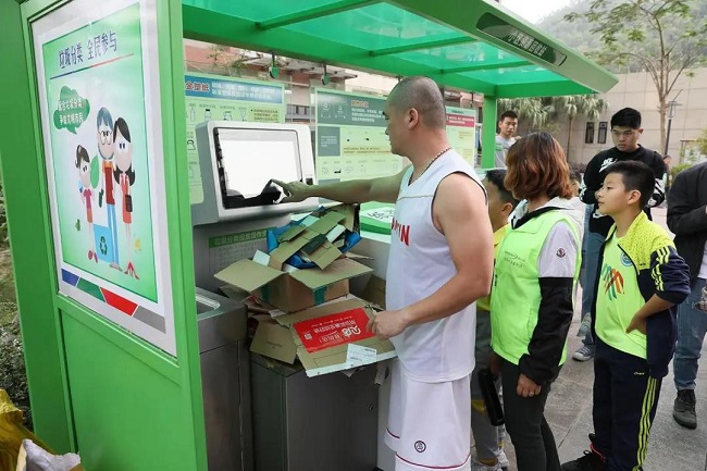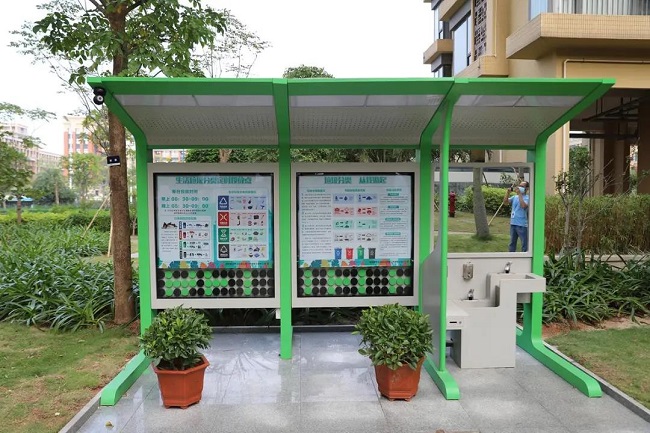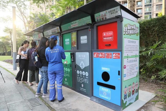 村民将家里的垃圾正确分类,并投放到门口的厨余垃圾和其他垃圾收集容器内,保洁员每天称量确认后,积分将自动累积到对应的家庭账户,居民可以凭借积分兑换相应的生活用品。
