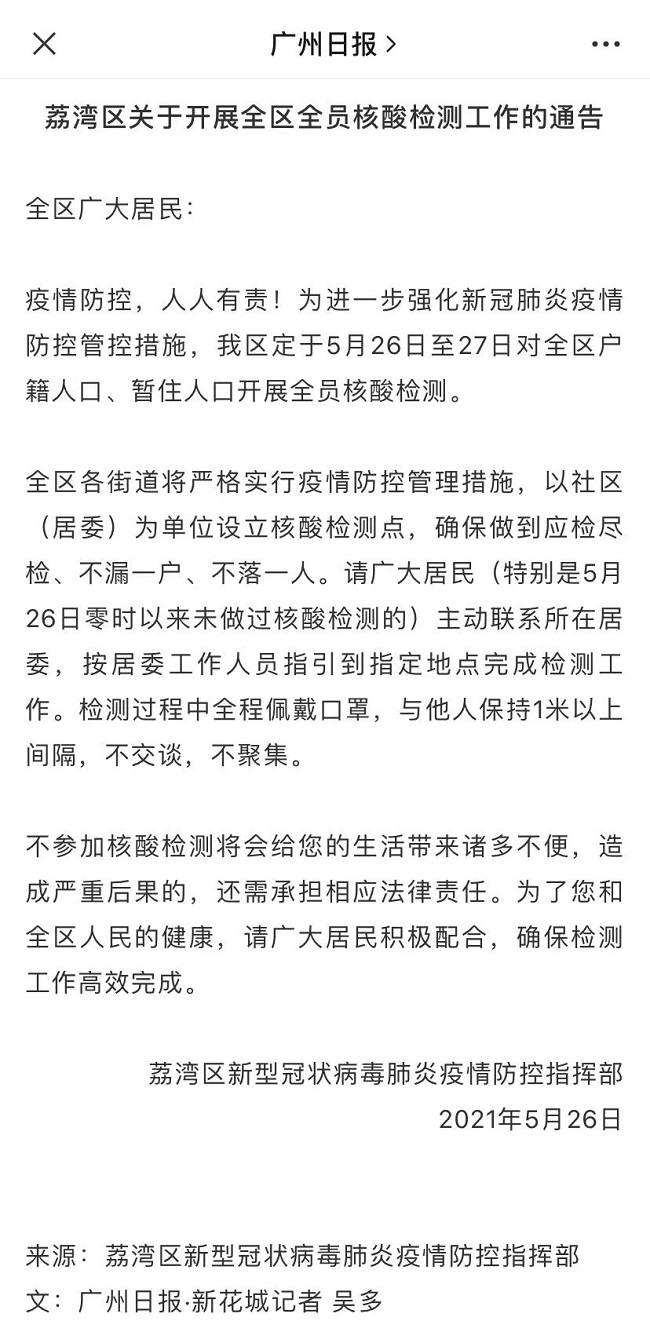 广州市荔湾区疫情防控指挥部发布通告