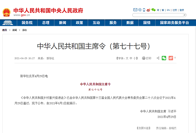 《中华人民共和国乡村振兴促进法》由第十三届全国人民代表大会常务委员会第二十八次会议通过,自今天(6月1日)起施行。乡村振兴促进法对产业发展、人才支撑、生态保护等方面做出具体规定,从法律层面确保乡村振兴战略部署得到落实,确保各地不松懈、不变调、不走样,持之以恒促进乡村振兴。